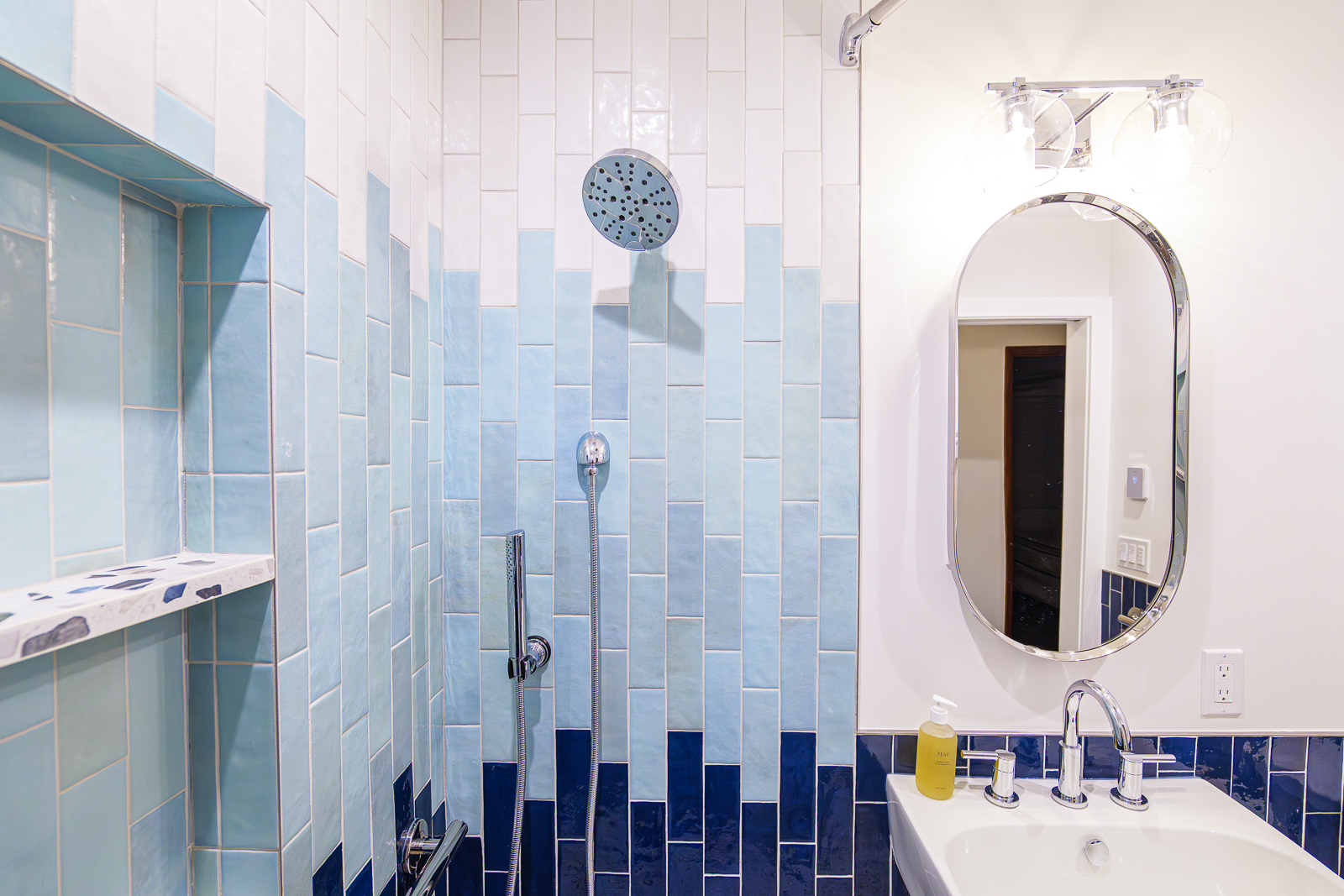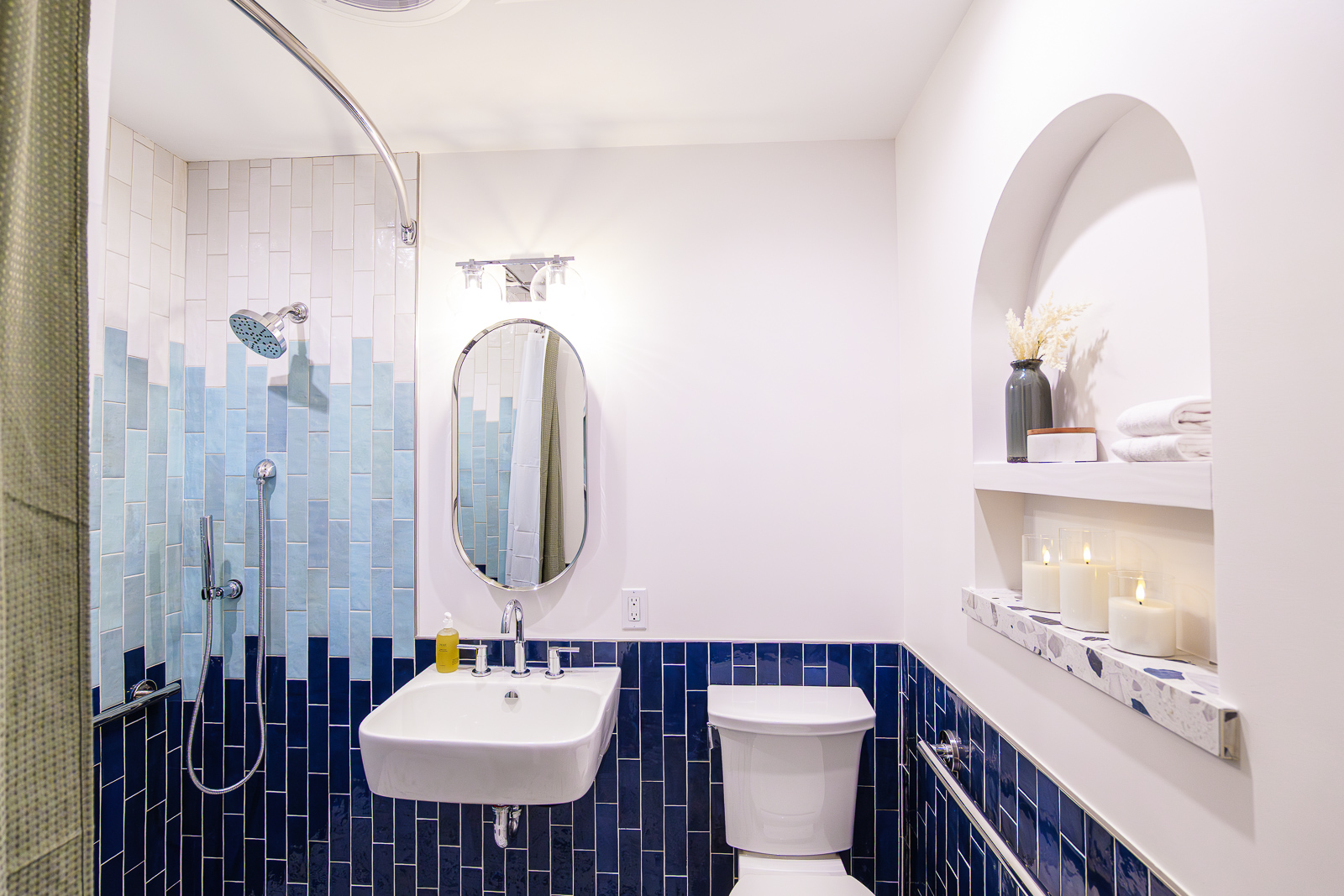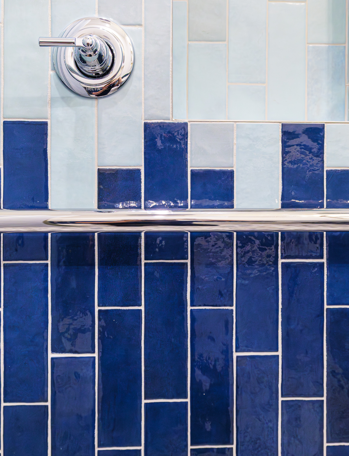 Staggered wall tile transitions from deep navy to soft sage and warm cream, adding visual depth without overwhelming the room.