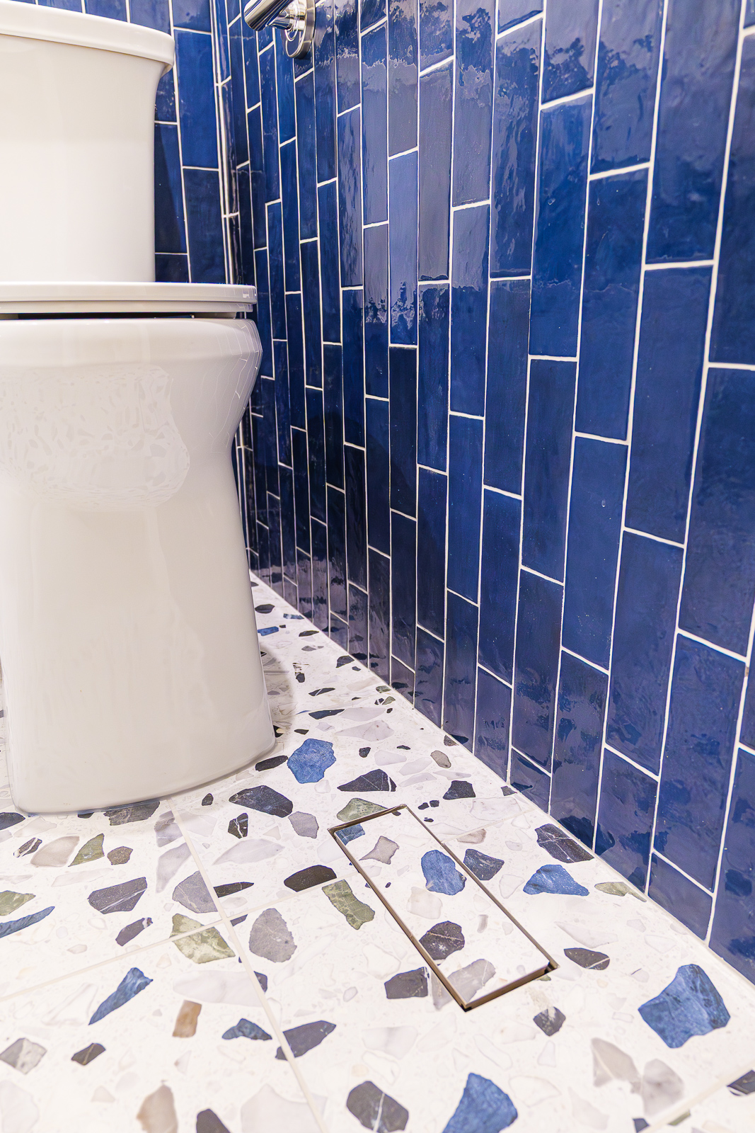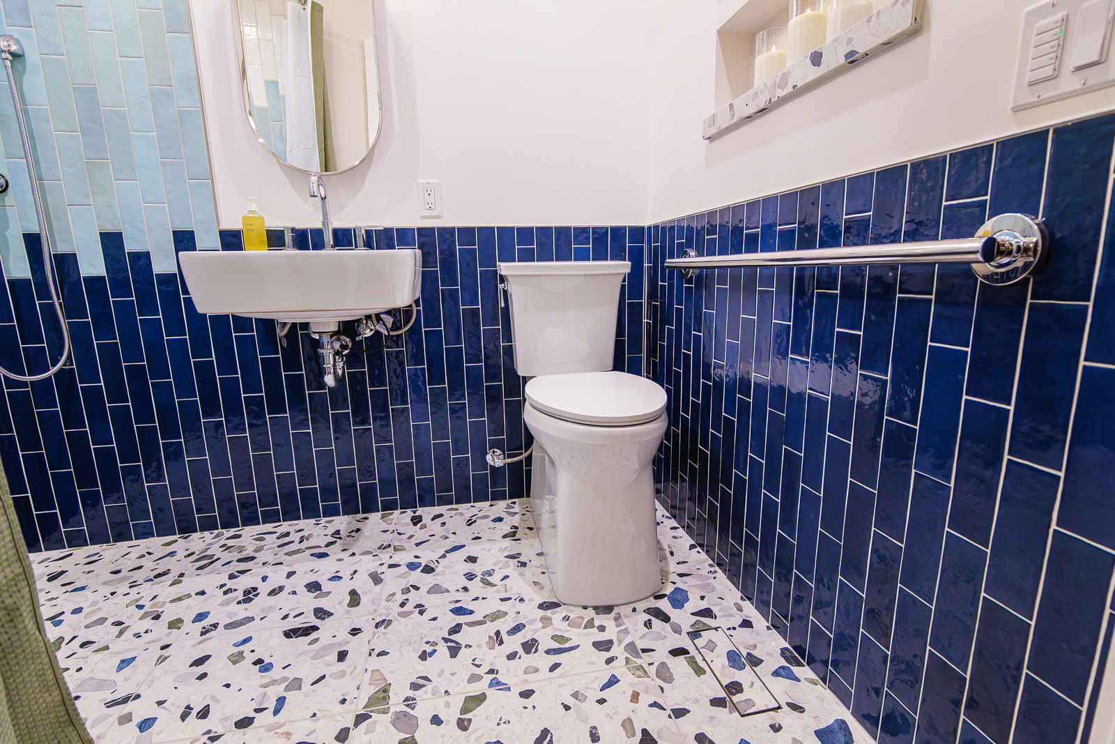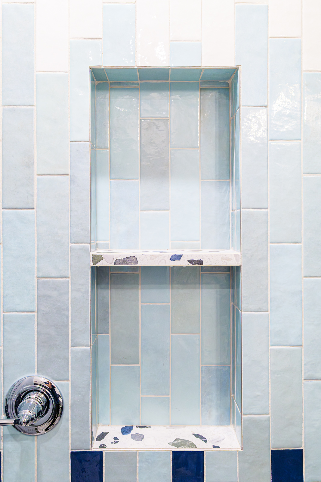 Staggered wall tile transitions from deep navy to soft sage and warm cream, adding visual depth without overwhelming the room.
